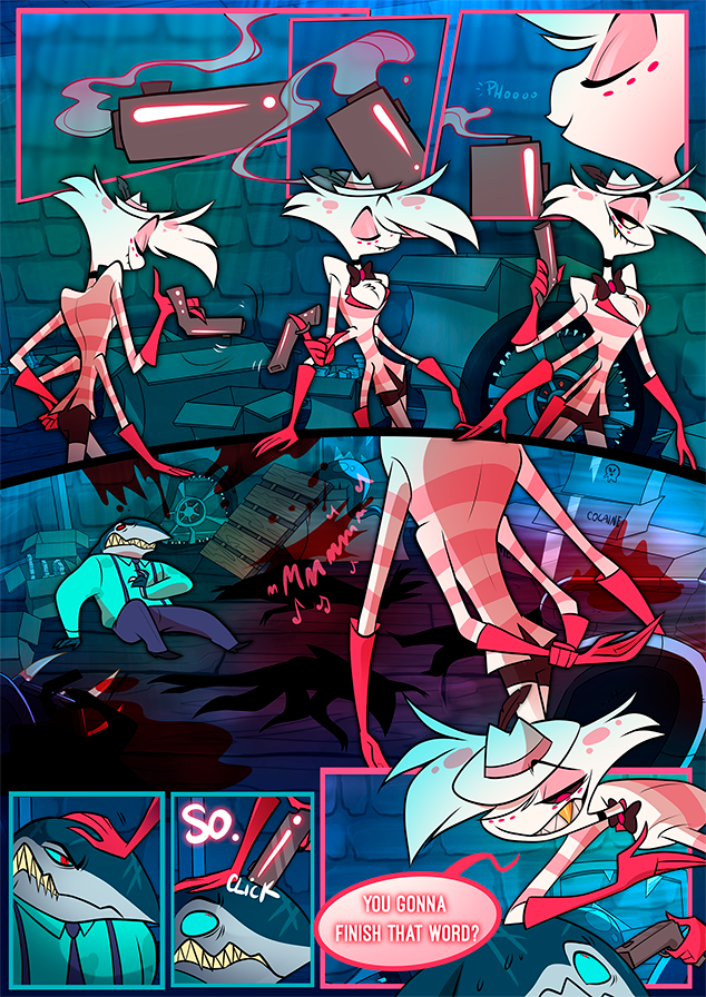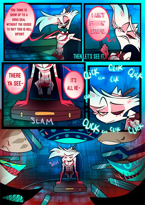 Комикс начинается с того, что Энджел Даст от имени Валентино заключает сделку по продаже наркотиков с группой демонов-акул. Лидер ставит сделку под сомнение, поскольку Валентино не пришёл, чтобы завершить её лично. Затем он угрожает Энджелу пистолетом и оскорбляет его. Энджел невозмутимо убивает всех присутствующих демонов огромным количеством оружия. Из-за этого Энджел вынужден уйти без заключённой сделки и с пустыми руками.