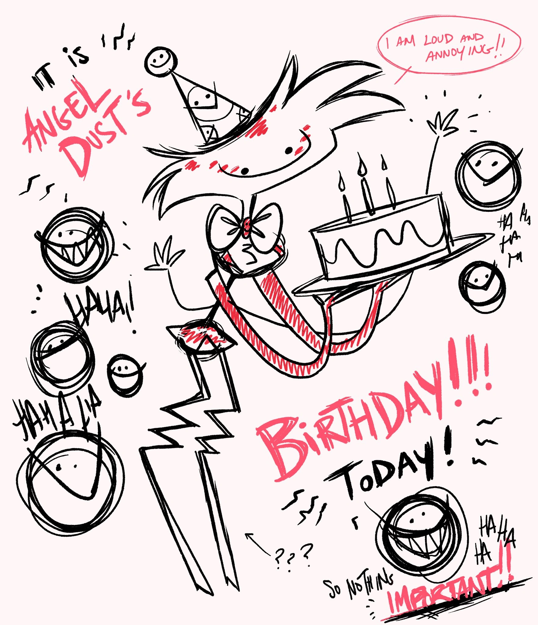 - В своем твите Вивьен Медрано упомянула, что одна из её любимых шуток, которую она написала, находится в сцене, где Энджел Даст и сэр Пентиус репетируют.Твит Vivziepop о её любимых шутках[14]