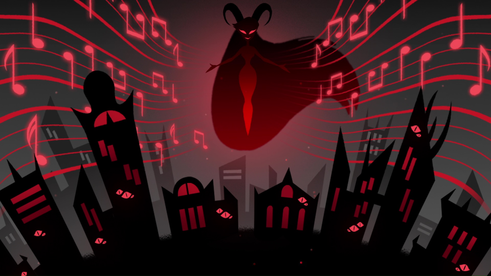 - Аластор в своей радио-башне, а также троица V в песне «Исчез» в эпизоде «Радио убило видео-звезду».